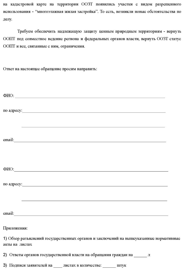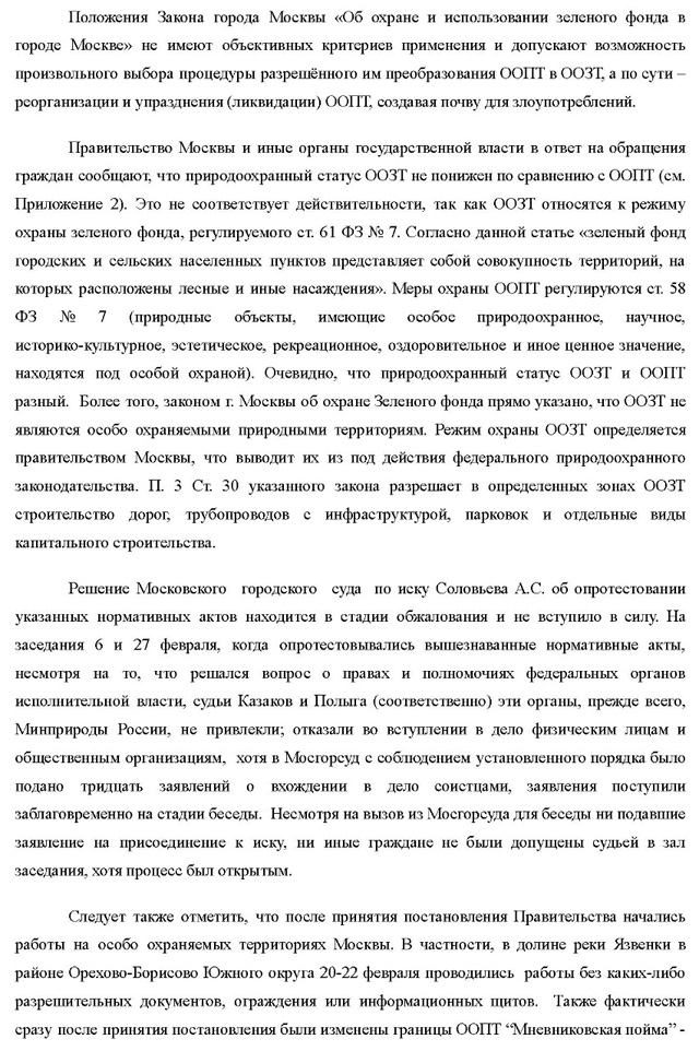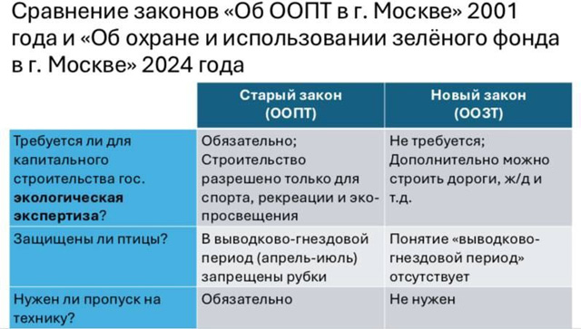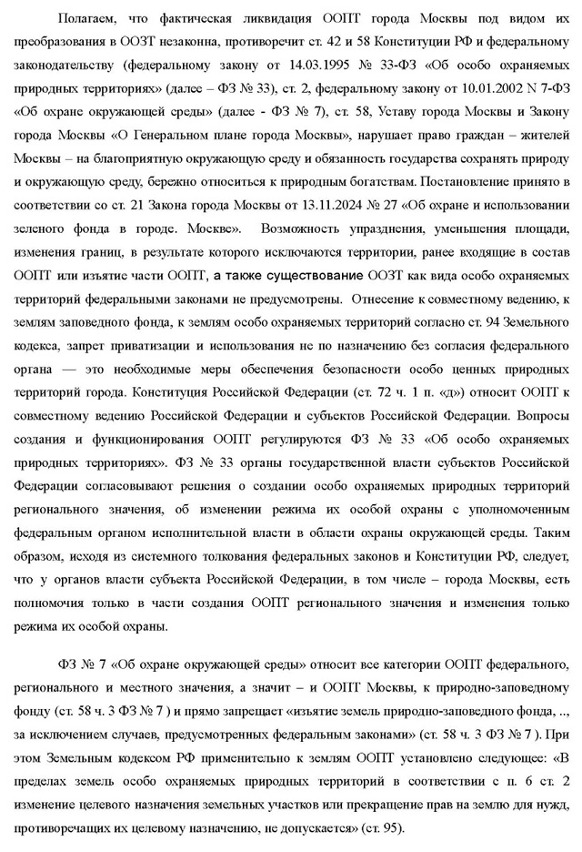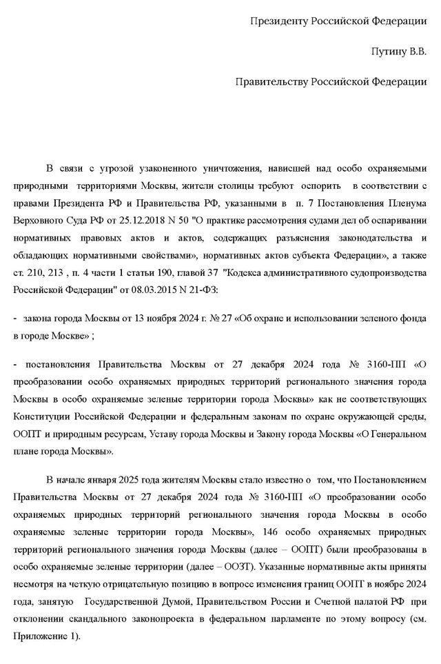 11.03.2025г. В связи с угрозой узаконенного уничтожения, нависшей над особо охраняемыми природными территориями Москвы ( преобразованием ООПТ в ООЗТ) зарегистрировано письмо Президенту РФ с 8599 подписями жителей столицы. Сбор подписей не окончен.