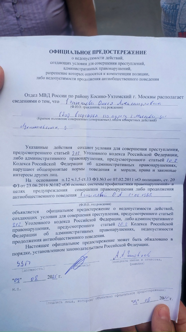 Вместо того, чтоб приехать и помочь соблюдать порядок, а порядок на РСО всегда, эти "стражи" составили ряд Предостережений, связанных с абсурдом. Служивые даже КОНституцию не знают - Коллективно ОСОЗНАННЫЕ Нормы.